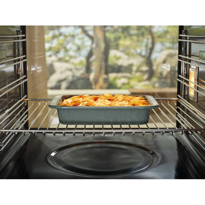 Design Durabil și Estetic: Finisajul exterior gri-granit cu puncte albe oferă un aspect modern, care arată excelent atât în cuptor, cât și la servirea directă pe masă.